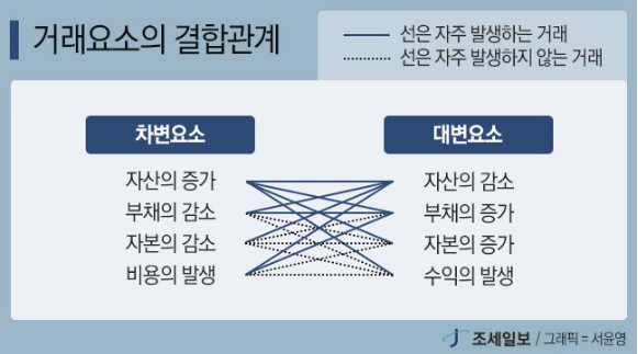 - [ 자산의 증가*감소 / 부채의 증가*감소/ 자본의 증가*감소 / 수익과 비용의 발생 ] -> 8요소.