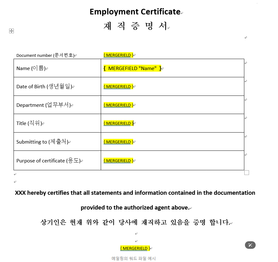 " { MERGERFIELD } " 라고 표시된 부분은 변수로 적용되는 부분으로서,