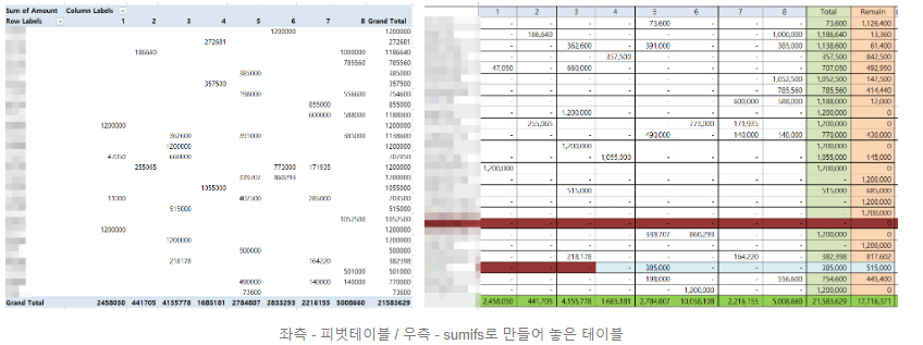 피벗테이블은 수정 작업을 적용해야 하는 반면,