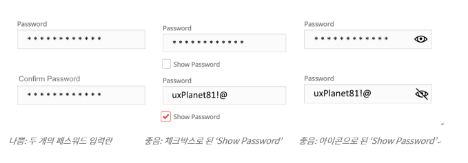 "비밀번호 보기"옵션을 체크박스 또는 "눈 모양 아이콘"으로 제공해서,