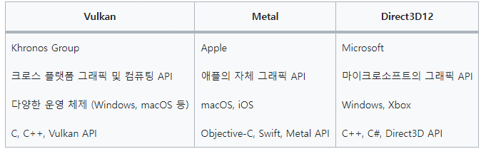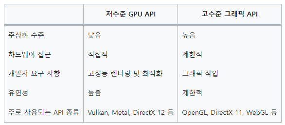 - 저수준 GPU API는 그래픽 처리를 위한 하드웨어 인터페이스를 제공하는 프로그랭밍 API