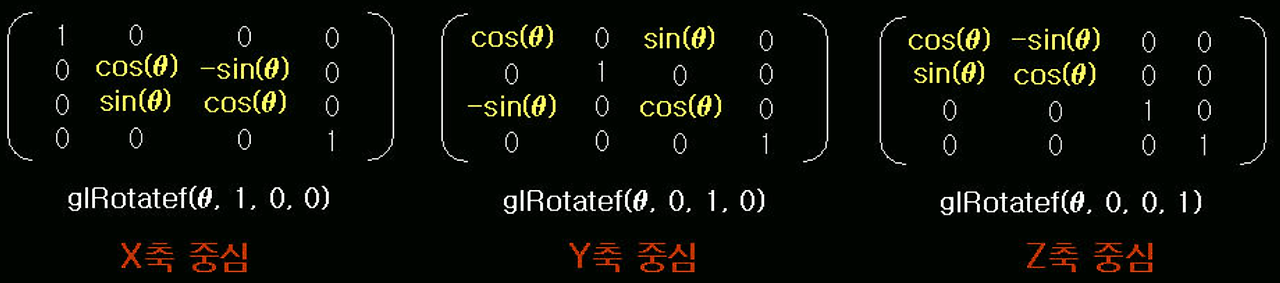 - 한 축을 기준으로 어느 각(쎄타)만큼 이동시킬 때 아래와 같은 매트릭스가 사용됩니다.