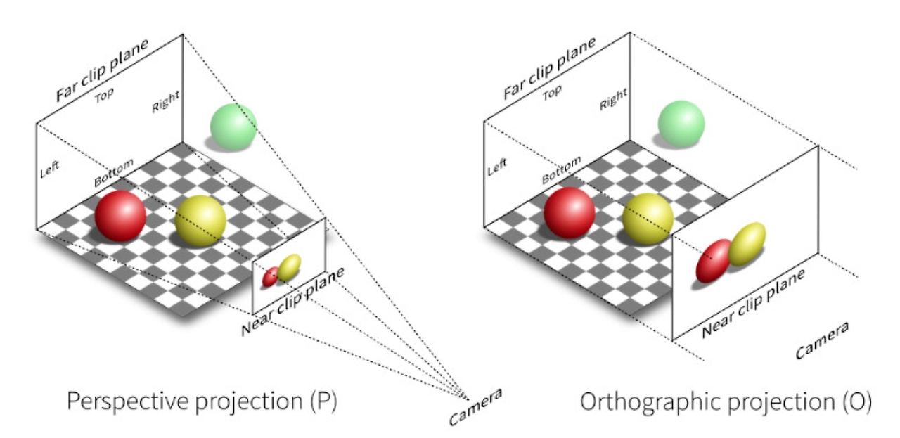- 카메라가 모델을 볼 수 있는 화각, 카메라에서 뻗어나가는 사각뿔 모양의 절두체가 Projection임