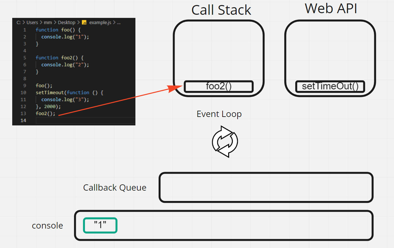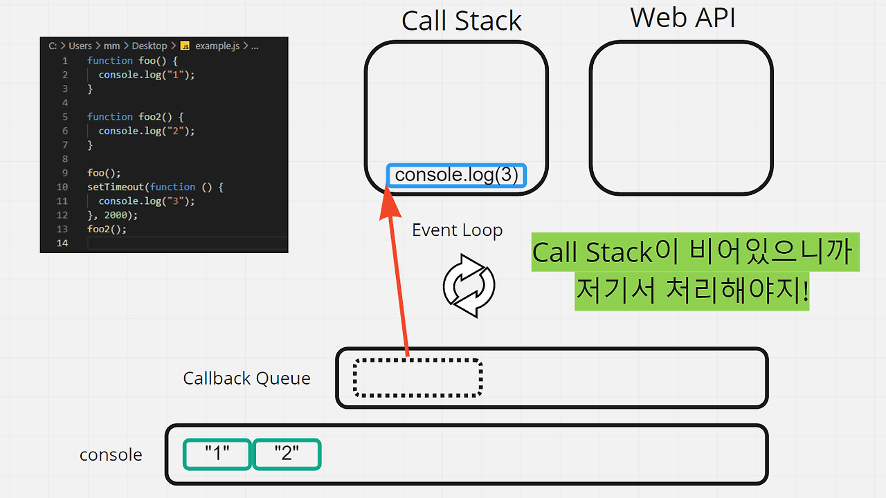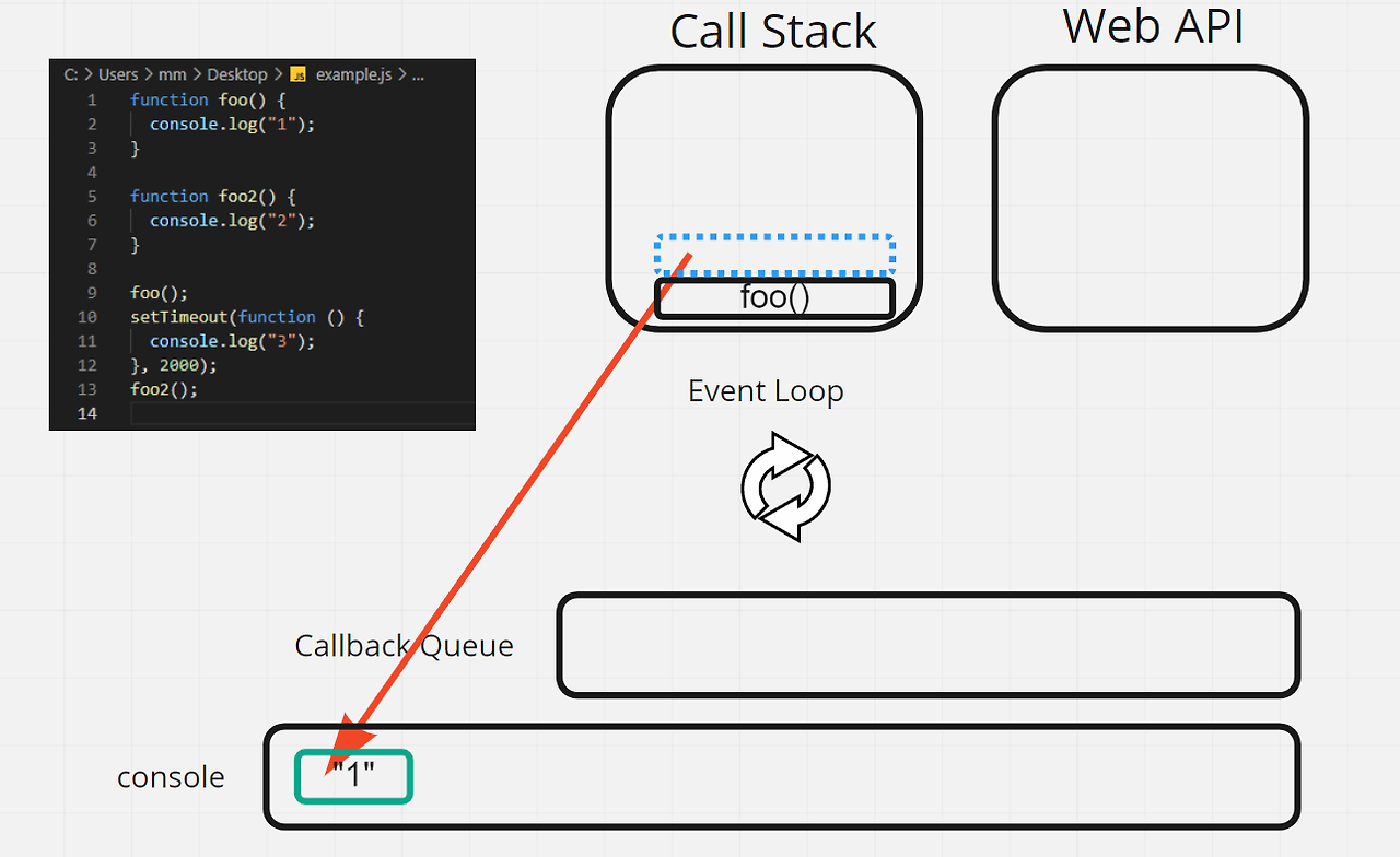 즉! Call stack에서 foo2() 함수를 처리하고 있었고, Web API에서는 setTimeOut()을 2초 동안 돌리고 있었다는 것!