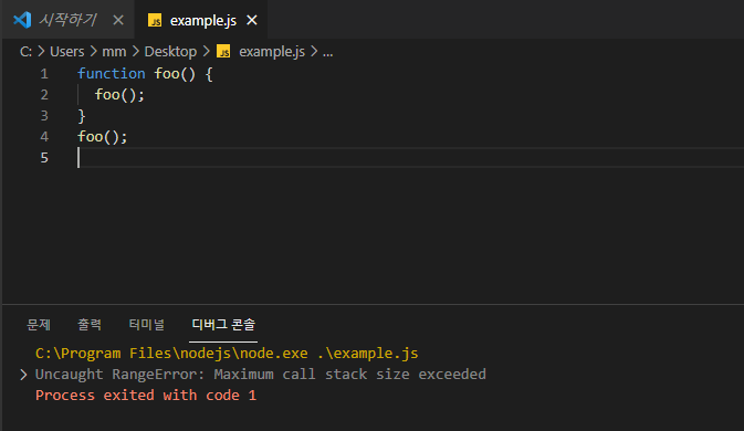 무한 루프가 돌게되는 코드를 돌리면, Maximun call stack size라는 에러가 발생하게 됩니다.