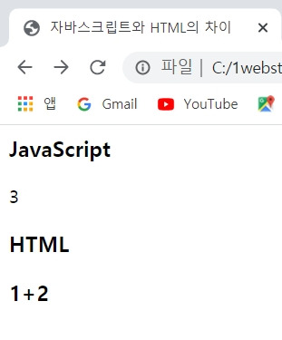 자바스크립트는 1+2에 대한 연산을 실행하여 출력을 하는 동적인 특징을 갖지만 HTML은 정적이므로 값을 그대로 출력만!