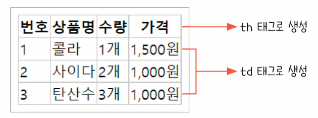 : th(table header) 태그와 td(table date) 태그는 표에서 열을 생성할 떄 사용 합니다.