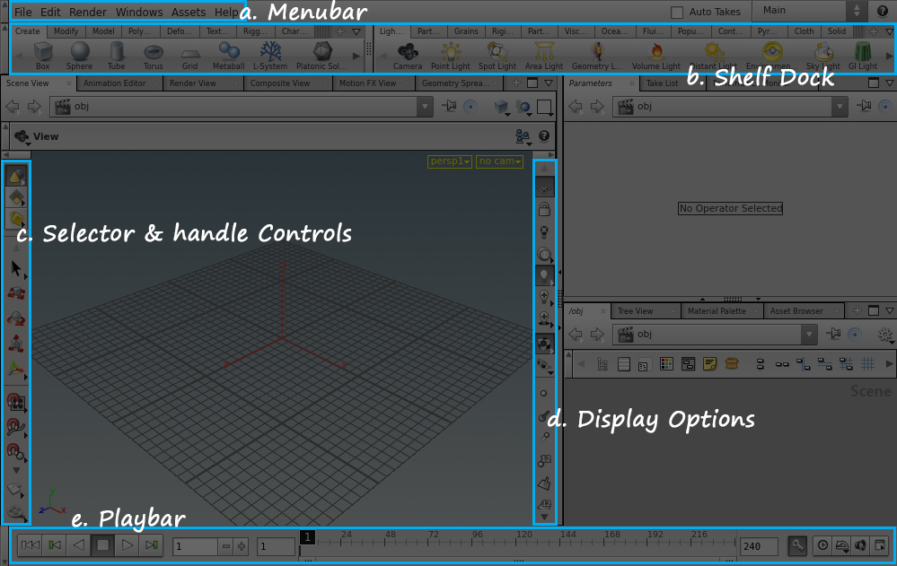 A. Menubar: 후디니 전반적인 영역에서 다양하게 제어하는 메뉴들로 구성되어 있습니다.