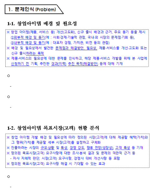 아래는 창업도약패키지 사업의 사업계획서 내 1. 문제인식 파트 양식입니다.