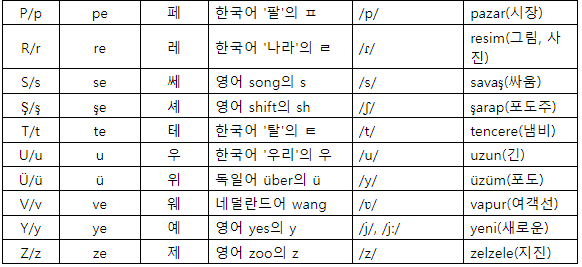 Ş ş [ʃ] 영어의 'sh' 발음. 한국어의 '쉬'에서의 'ㅅ' 발음 비슷. şa= 샤, şe= 셰, şi= 시 / şerefe [셰레페]: 건배!