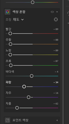 따뜻한 계열이 보정 목적이면, '파랑'과 '바다색'을 줄여줍니다.