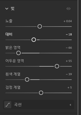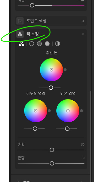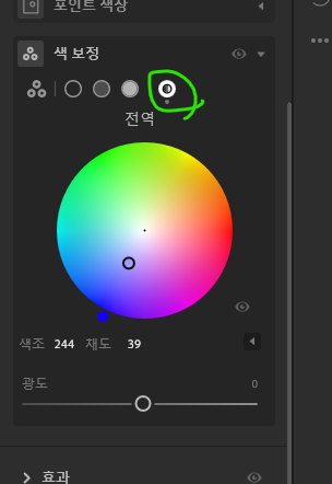 색보정 탭에서, 전체적인 색감을 한번에 잡아줍니다.