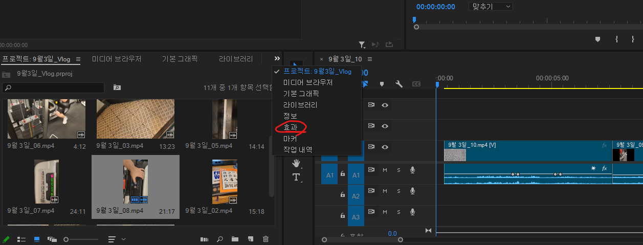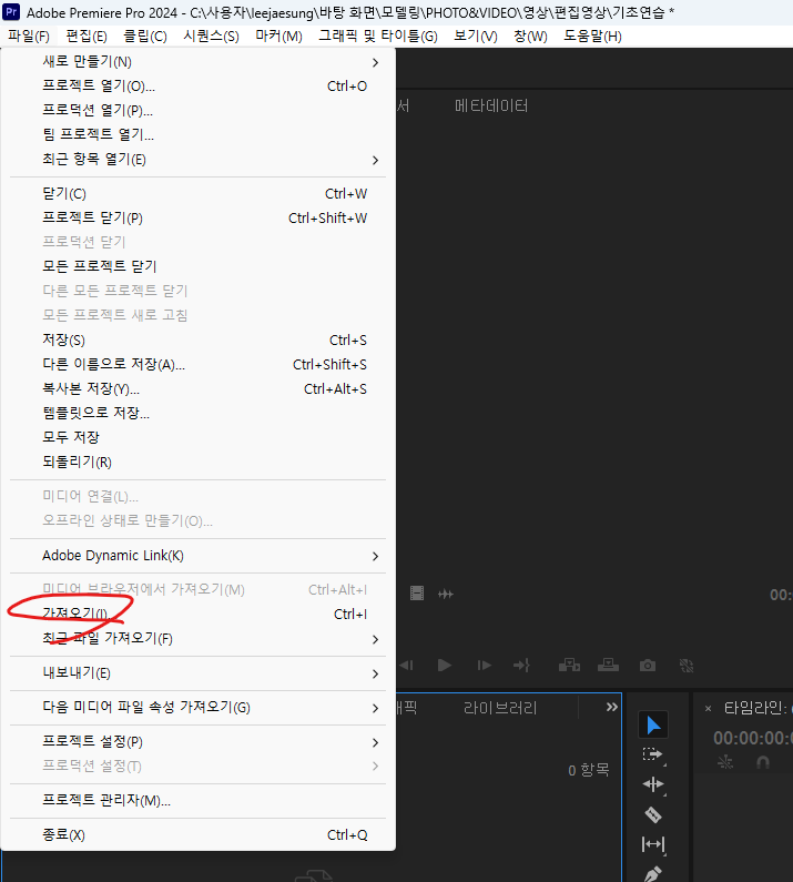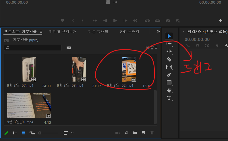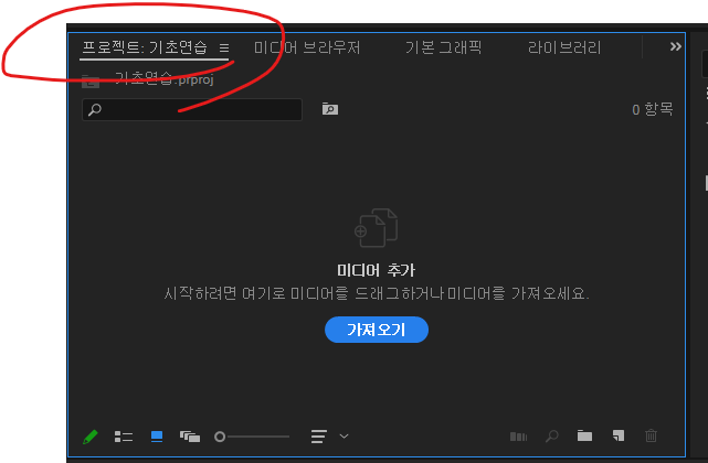 좌측 하단, '프로젝트'탭에서 편집할 영상이나 소리 등등을 가져와줍니다.