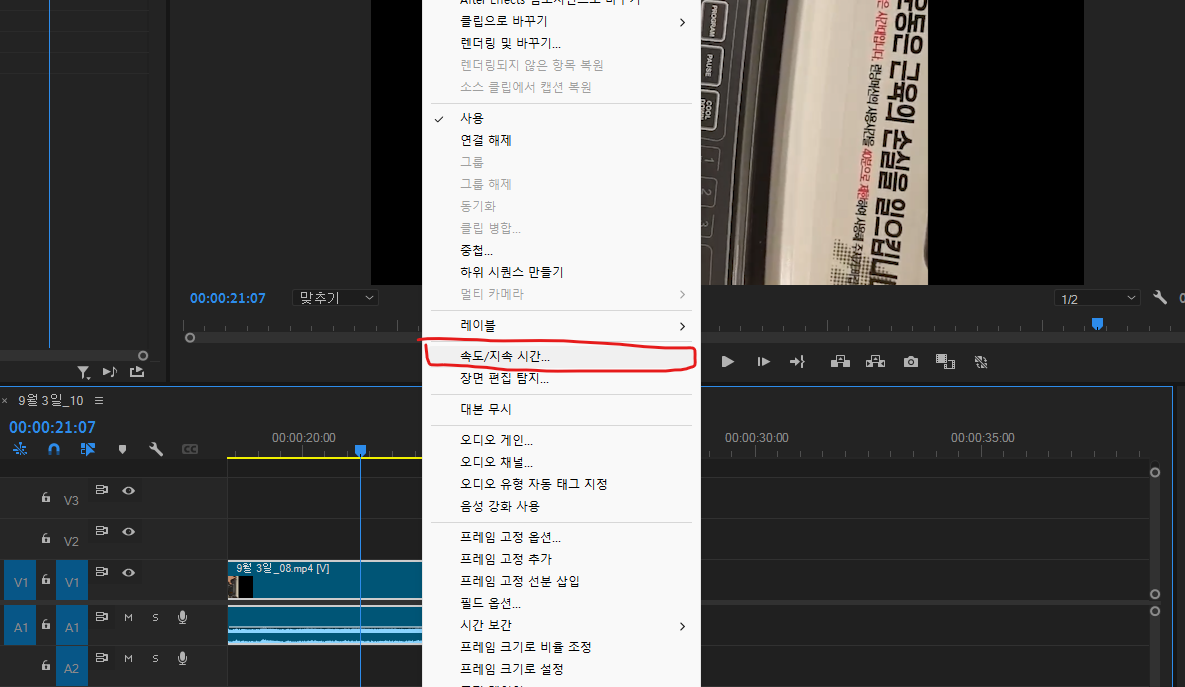 속도를 조절하고 싶은 컷을 선택하고 우클릭을 해줍니다.