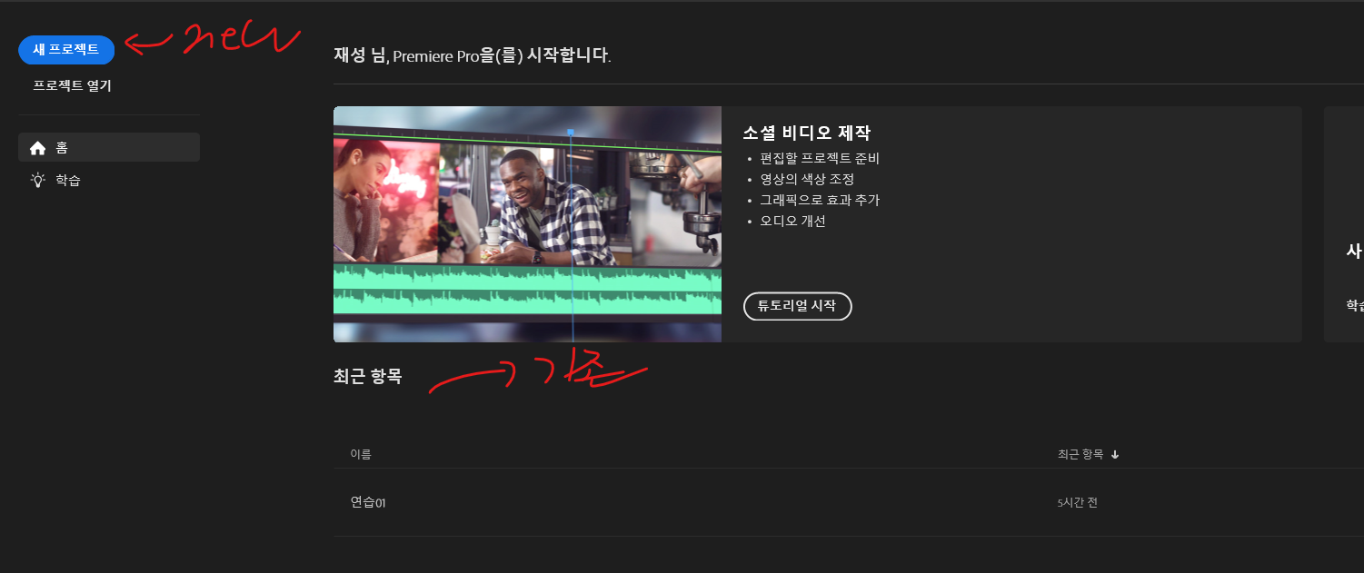 새로 편집 프로젝트를 만들기 위해, 새 프로젝트를 클릭하면