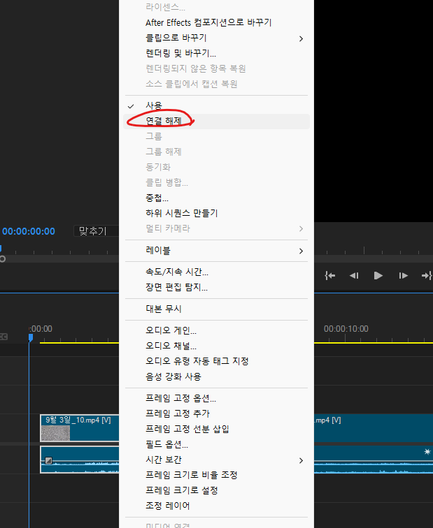 - 프리미어 프로는 기본적으로 '오디오'만 단독 선택이 되지 않기 때문에 영상과 오디오의 연결을 끊어줘야 합니다.