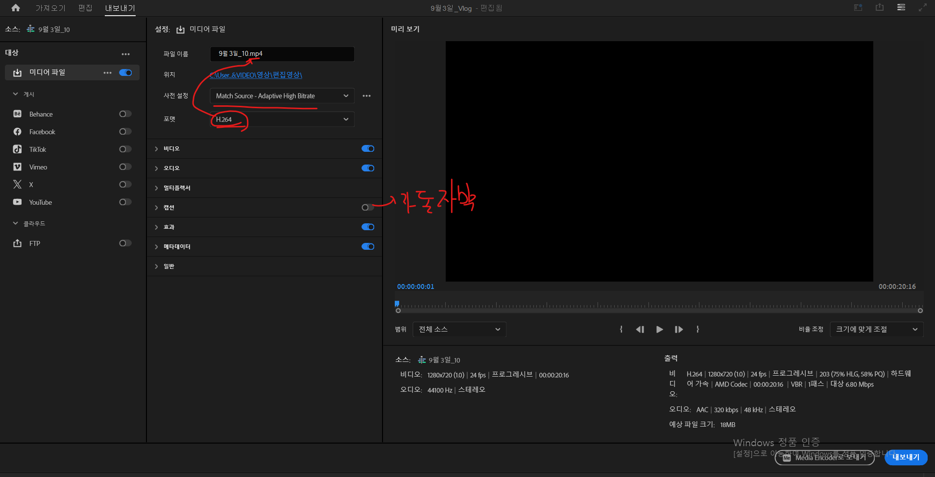 내보내기 탭에서 설정값을 맞춰 준 뒤 내보내기 버튼을 눌러줍니다.