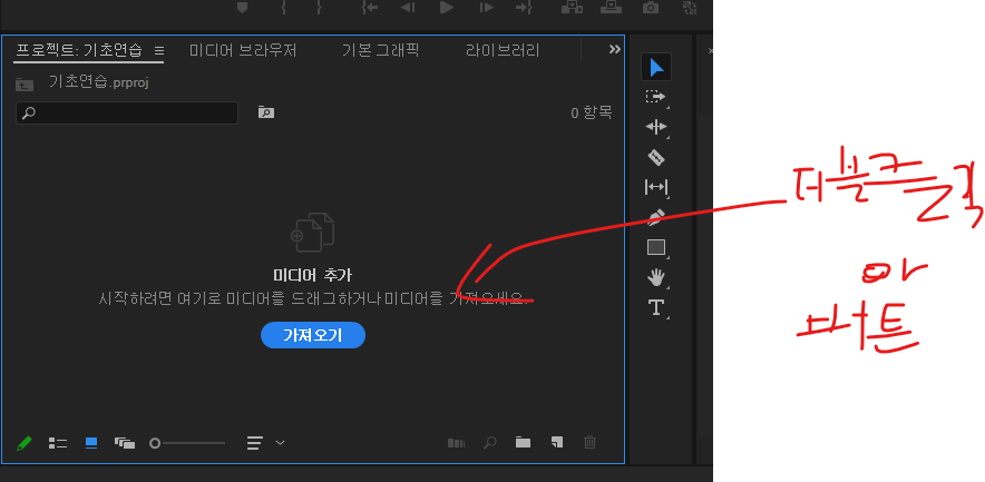 미디어 추가탭에서 더블클릭하거나, 가져오기 버튼을 클릭해서 파일을 Import해줍니다.