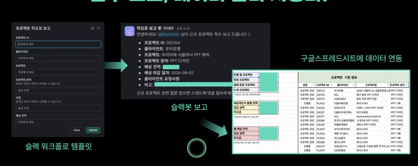 - > 슬랙봇 - 구글 스프레드시트를 연동해 업무 보고, 데이터 관리 자동화. [ 내 사업의 적확한 DB 확보 가능해짐 ]