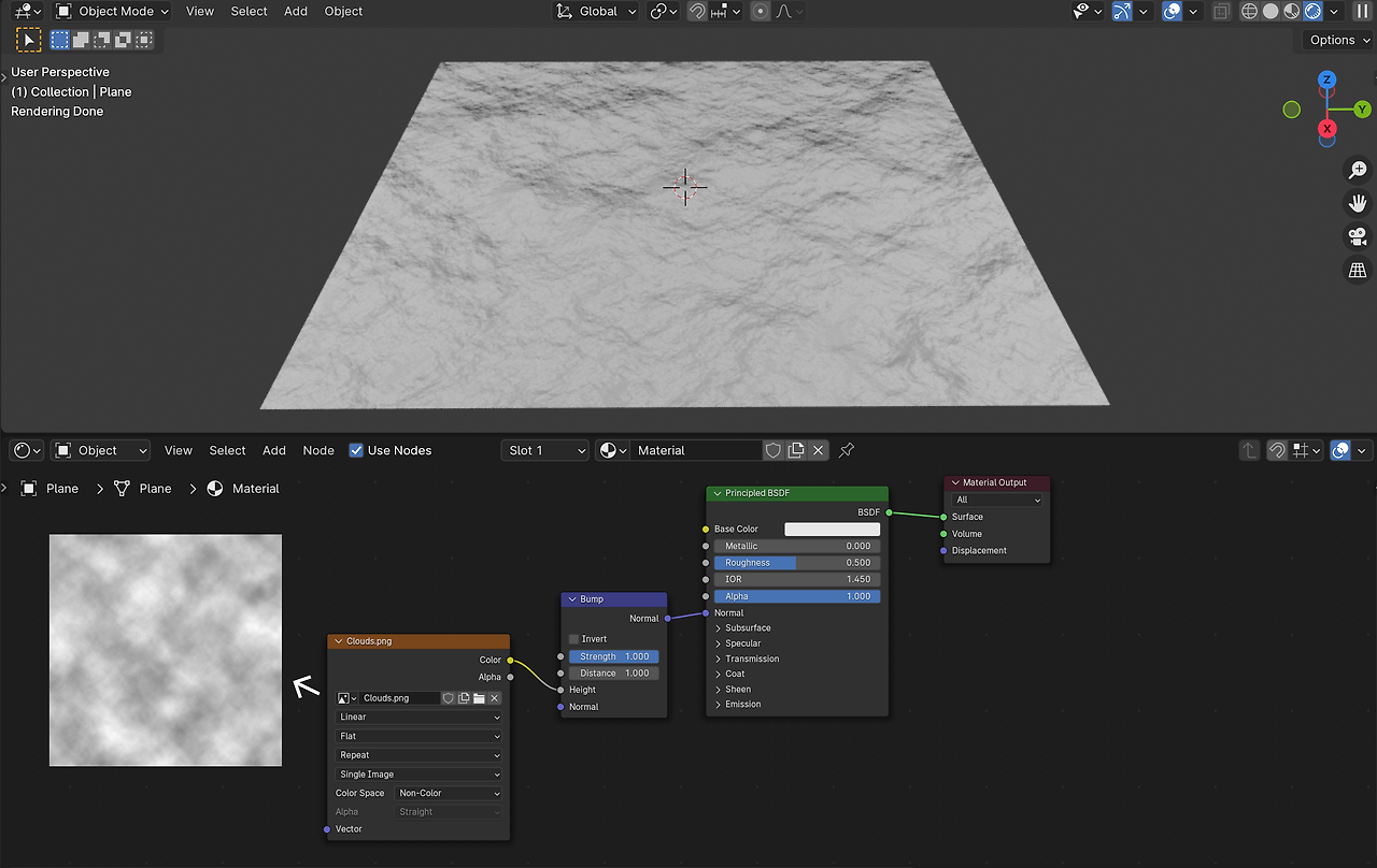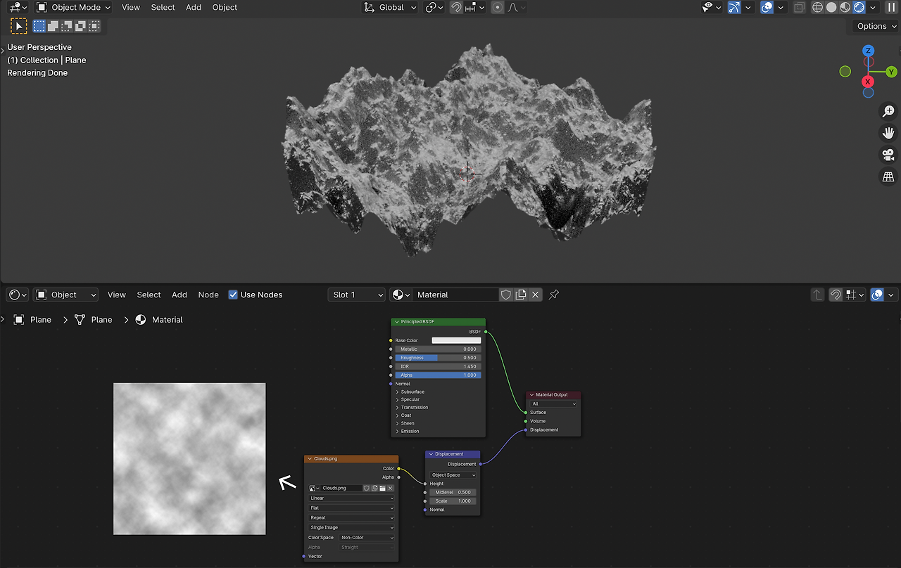 Displacement는 Plane의 Mesh를 변형하여 실루엣이 변형된 것을 볼 수 있습니다.