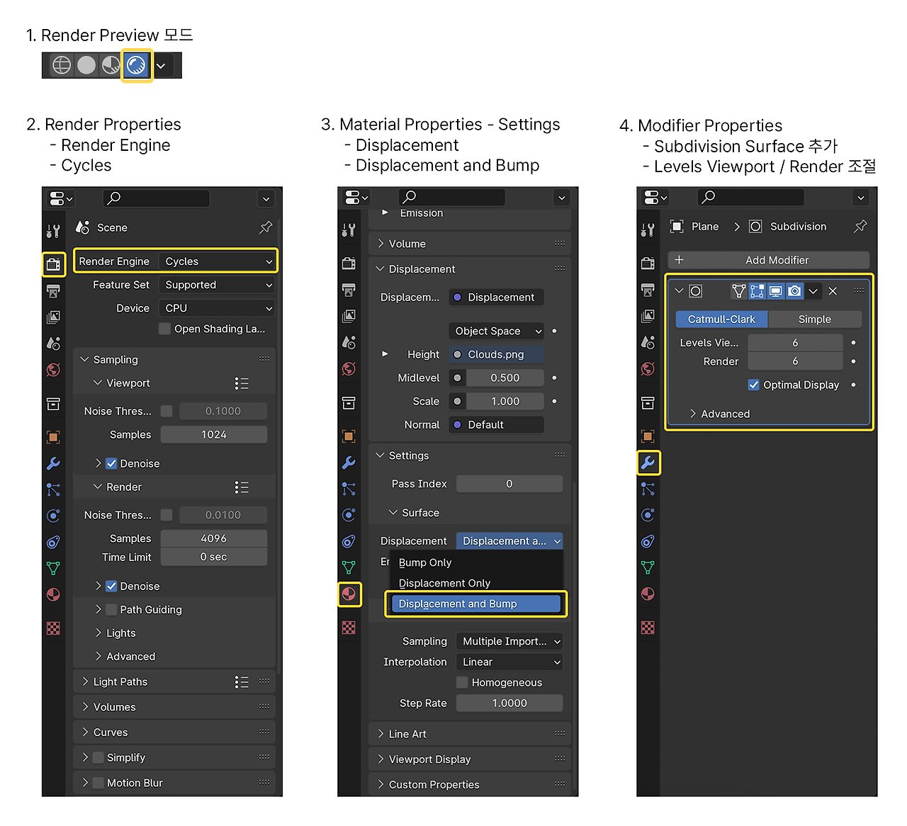 - Cycles로 변경 후, Material Properties - Settings - Displacement - Displacement and Bump로 설정해 줍니다.