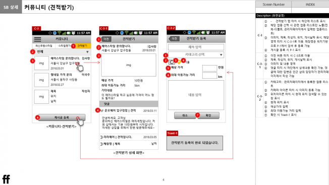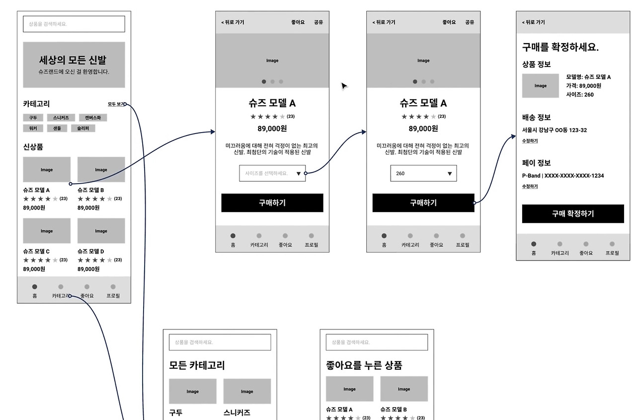 - 사전 설계 작업이 끝난 화면을 가지고, 사용자가 프로덕트를 사용할 때 대략적으로 어떻게 구동되는지