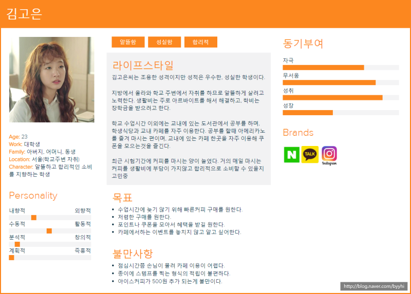 - 어떤 제품이나 서비스를 사용할 만한 목표 연구 집단 안에 있는 다양한 사용자 유형을 대표하는 가상 인물.