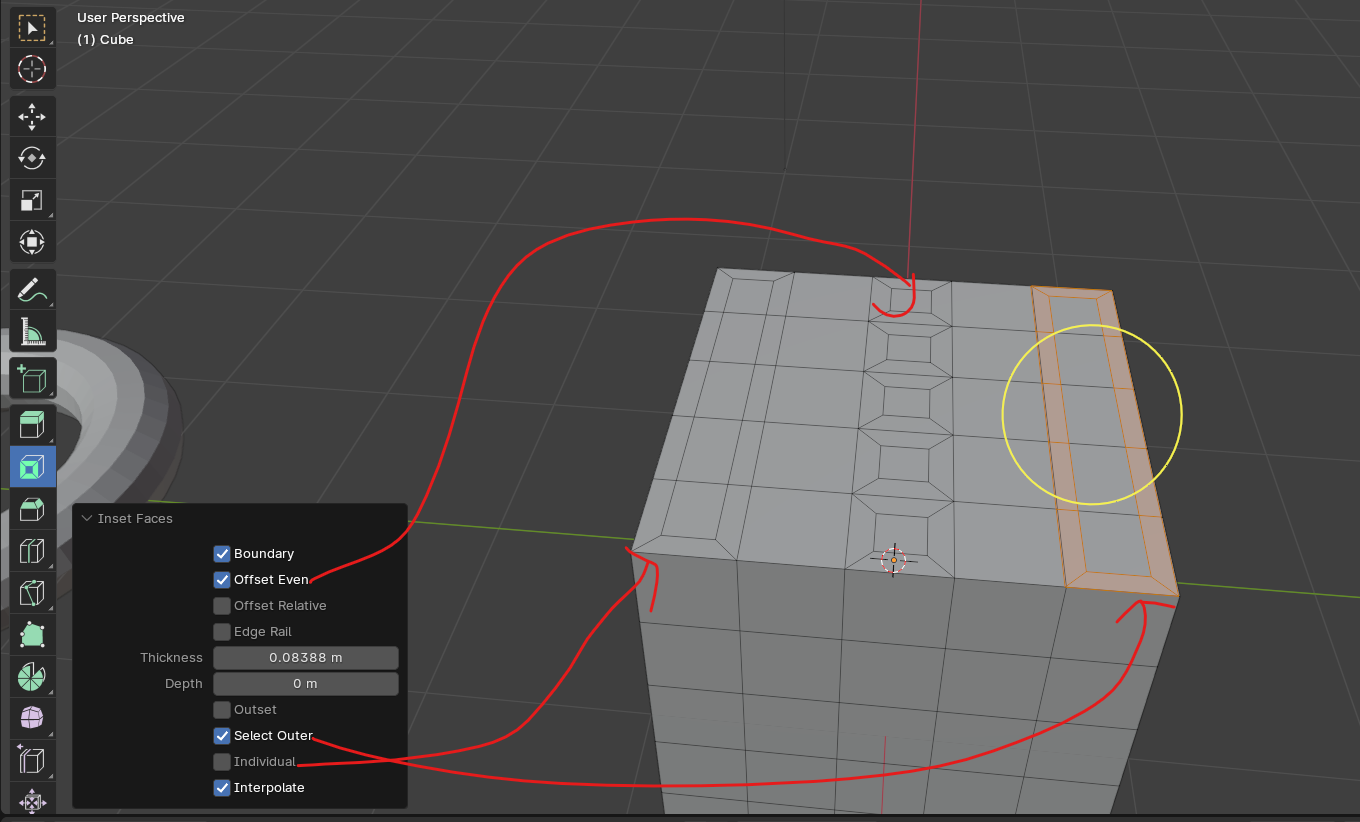 [ 블렌더 공부 ] 블렌더 모델링 기능 : Inset 단축키 : I Inset Face 기능을 사용하면 위 사진과 같은 오퍼레이션 패널이 나오게 됩니다. 최상단에, 옵션 Ui가 새로 나오기도 합니다. √ Boundary : 체크 해제 시 문지방 같이 아래에 생기는 걸 없애줍니다. √ Offset Even: Inset Face 기능으로 생기는 면들의 두께를 균일하게 맞춰줍니다. √ Select Outer: Inset 된 면 말고 그 바깥 테두리를 선택. √ Individual: 여러개 선택할 경우, 면 하나하나 따로 Inset 효과를 만들어줍니다.